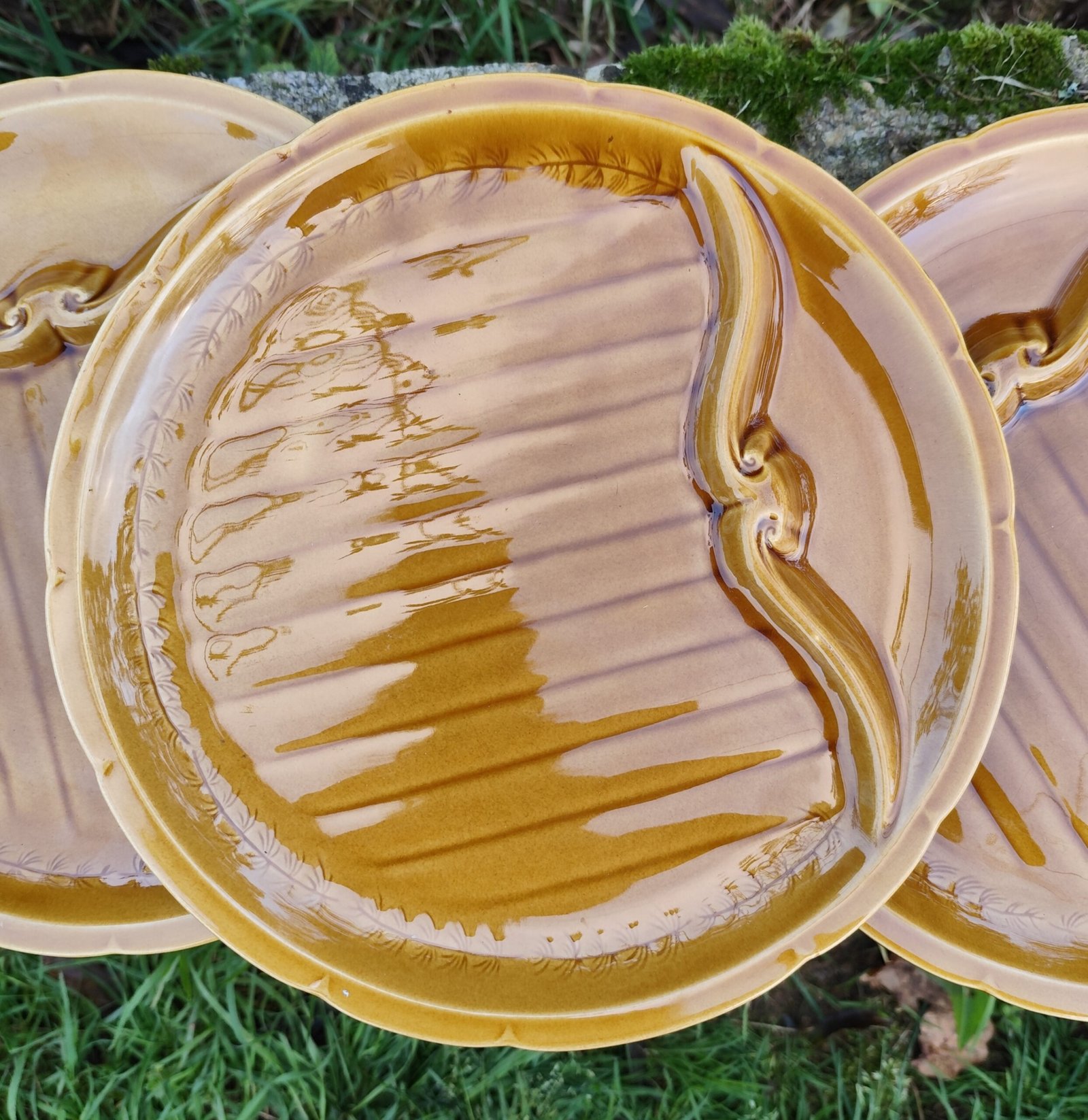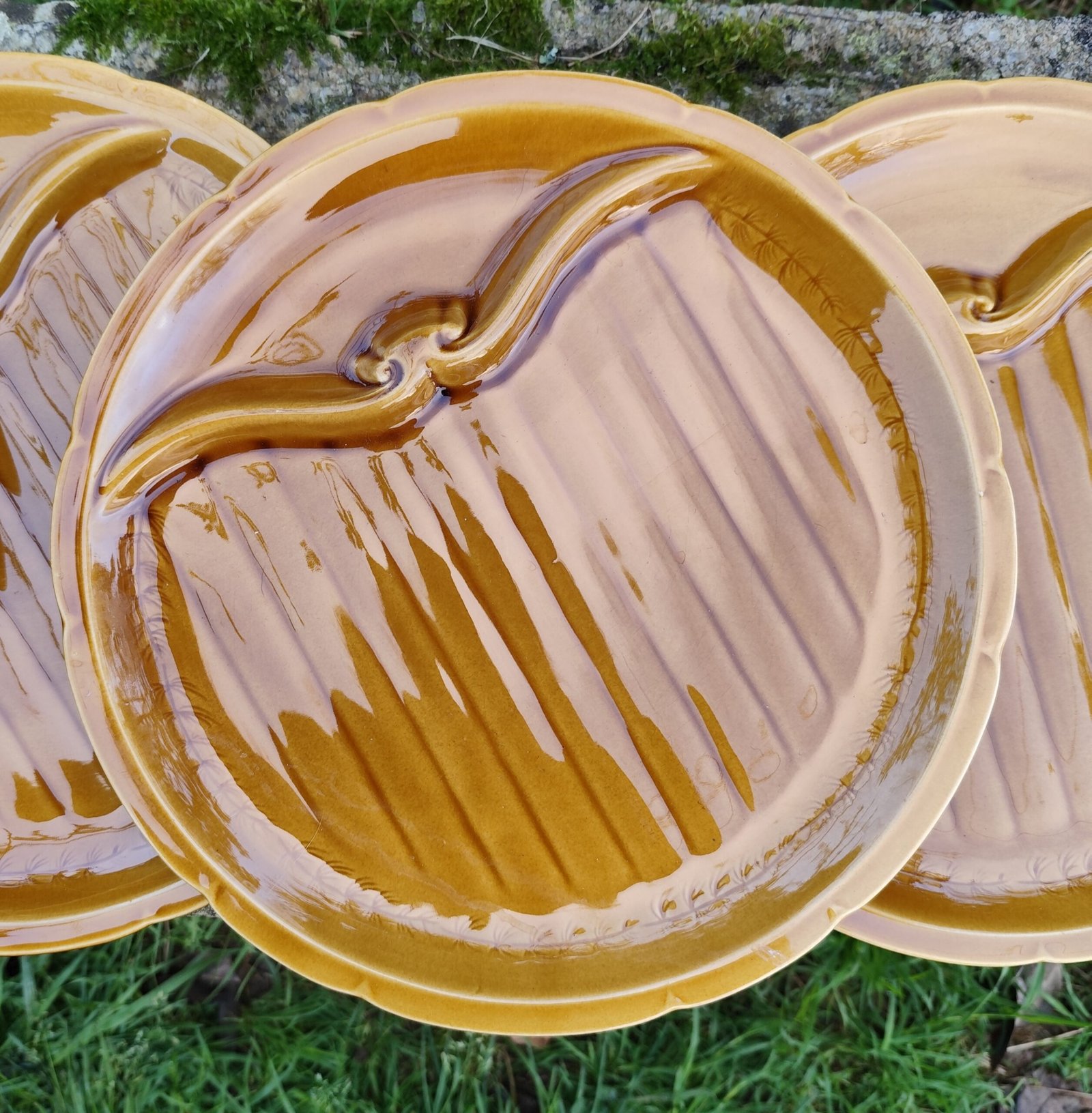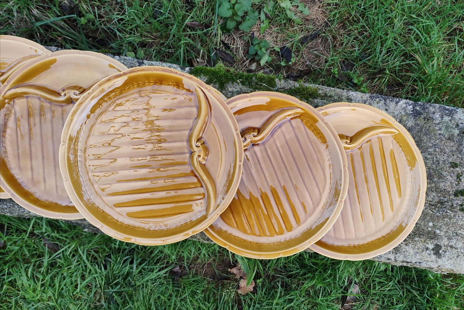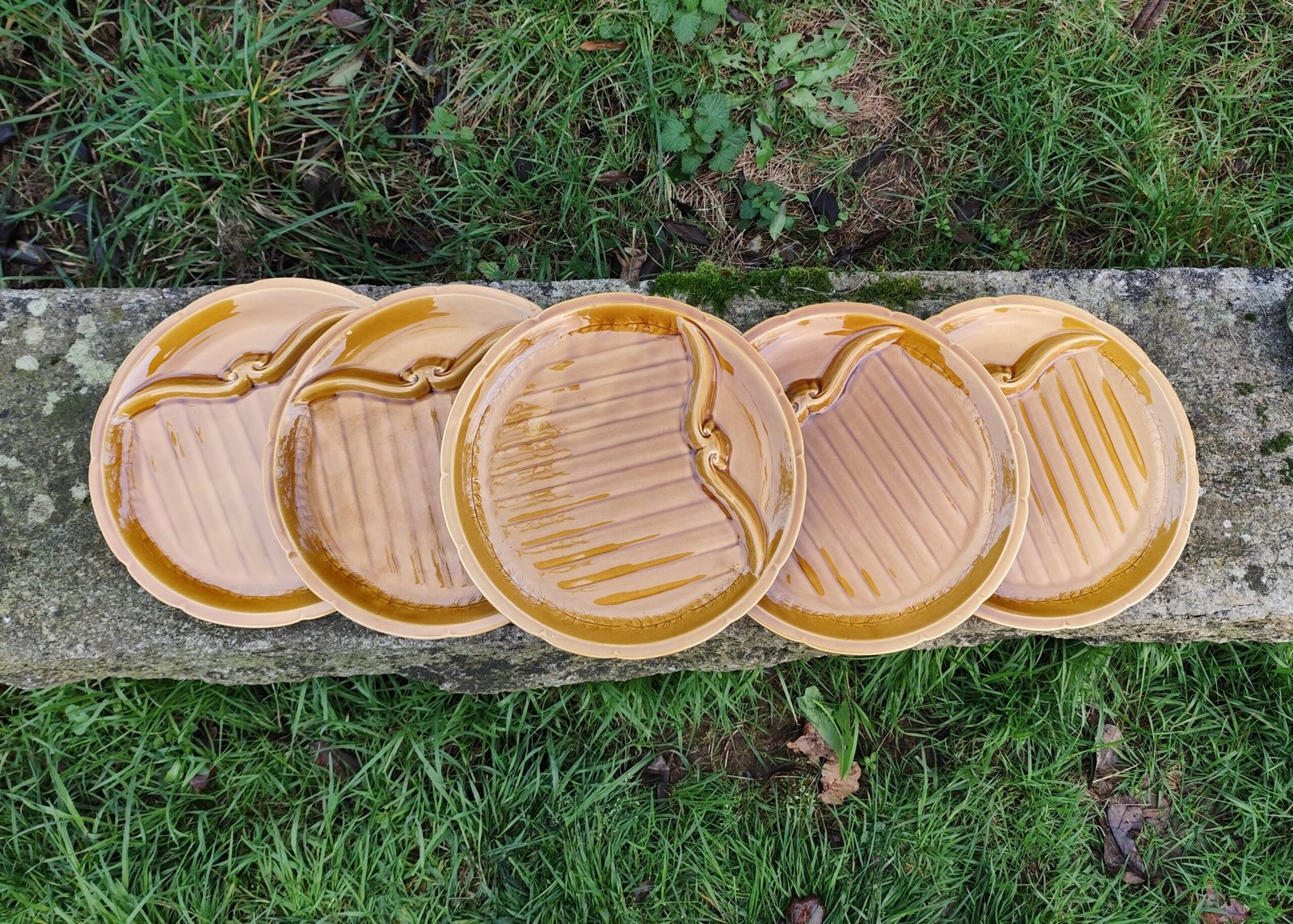 Ensemble de 6 assiettes à asperges de la manufacture de Gien. En barbotine marron. Années 1970.
