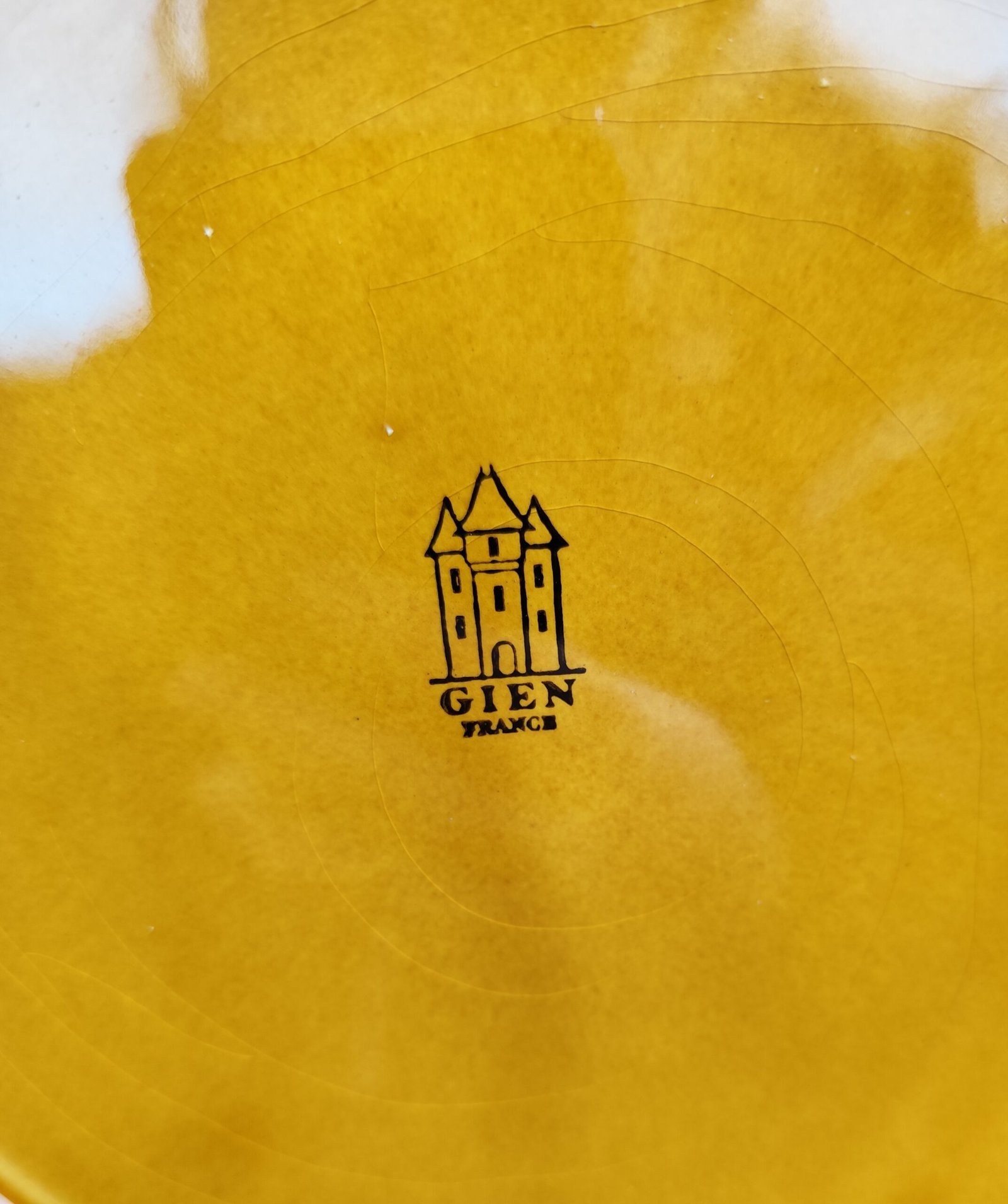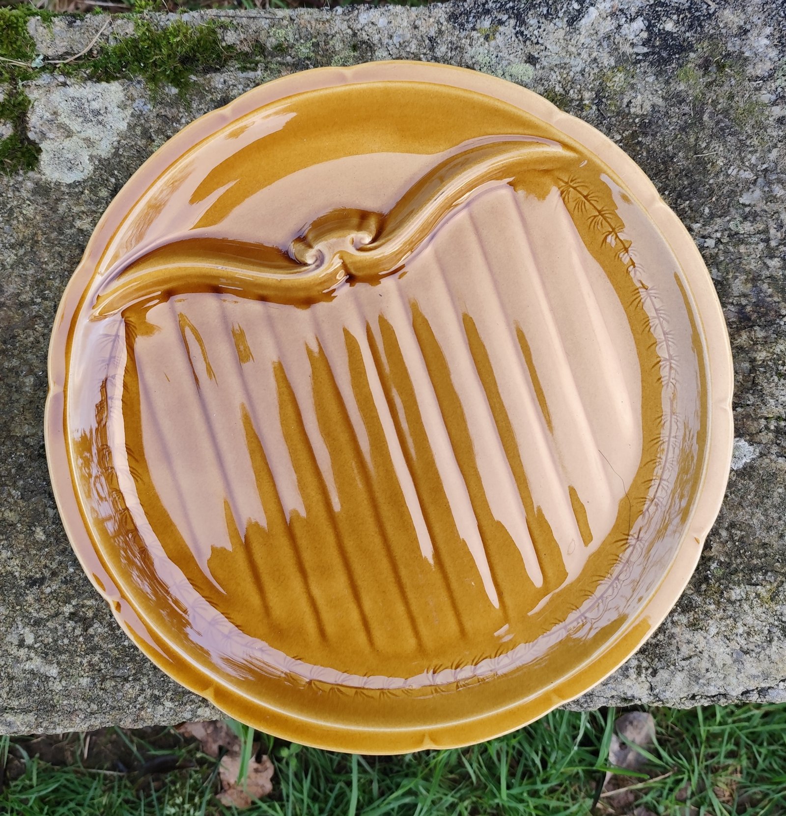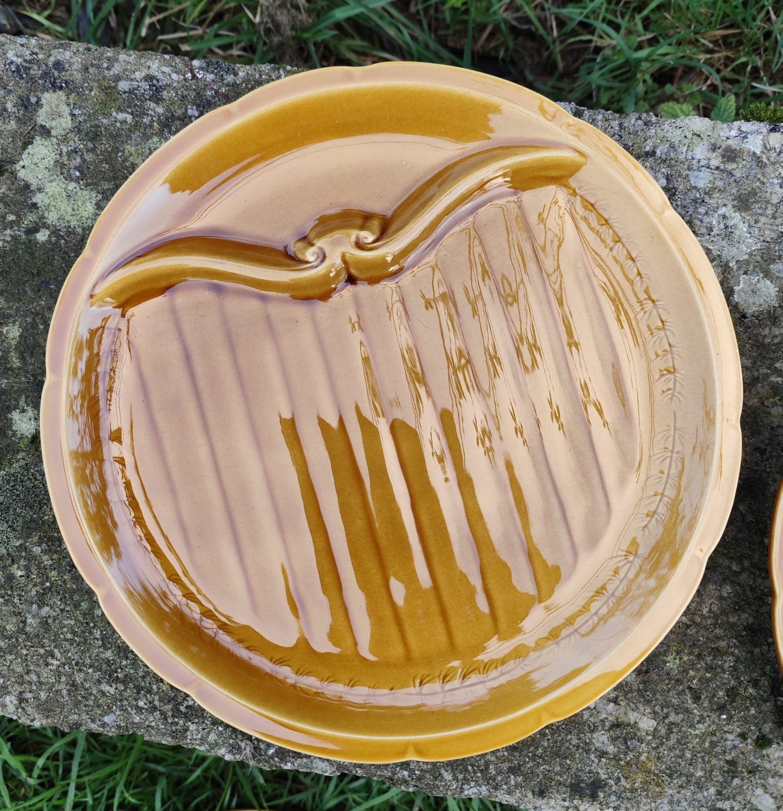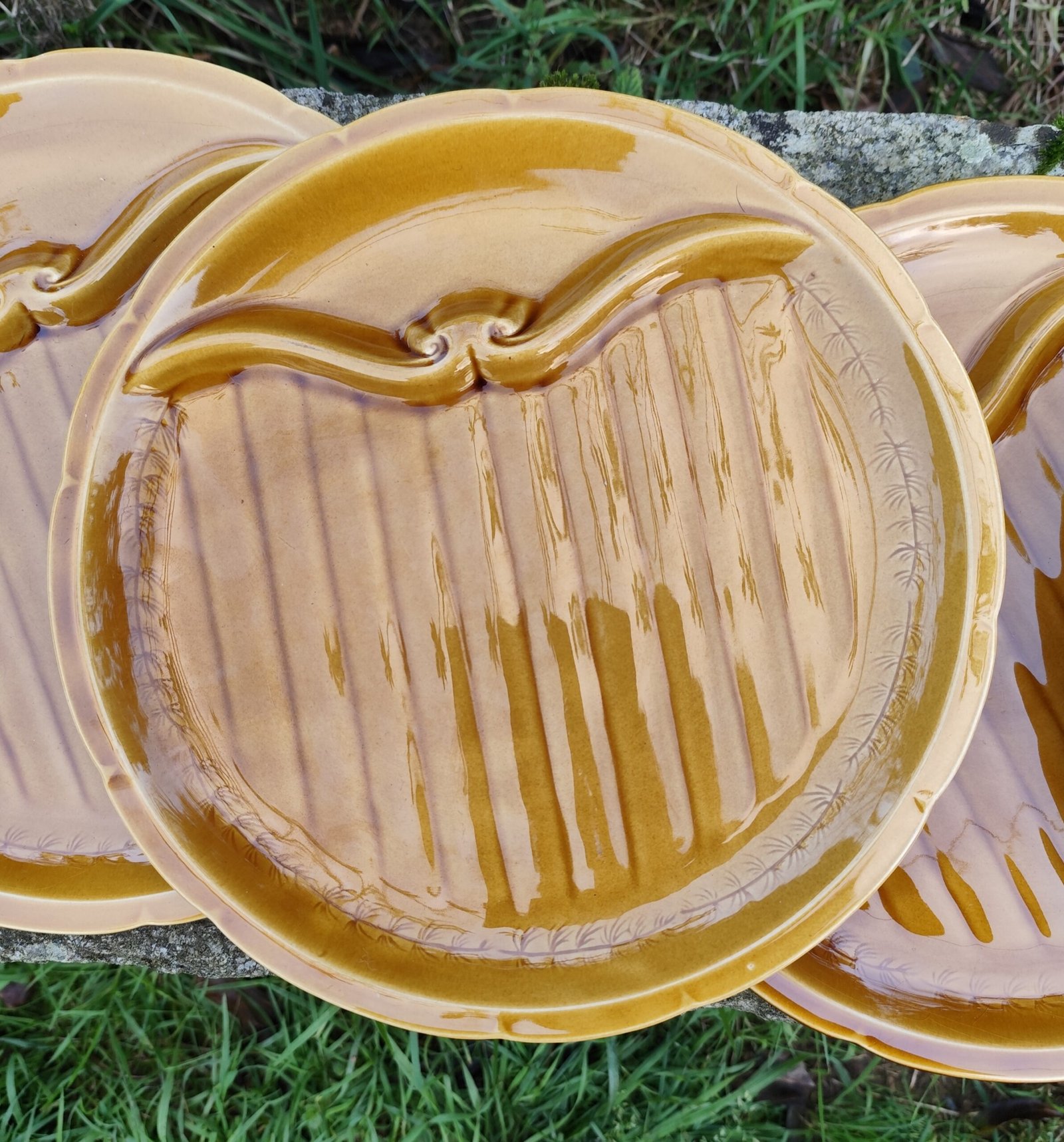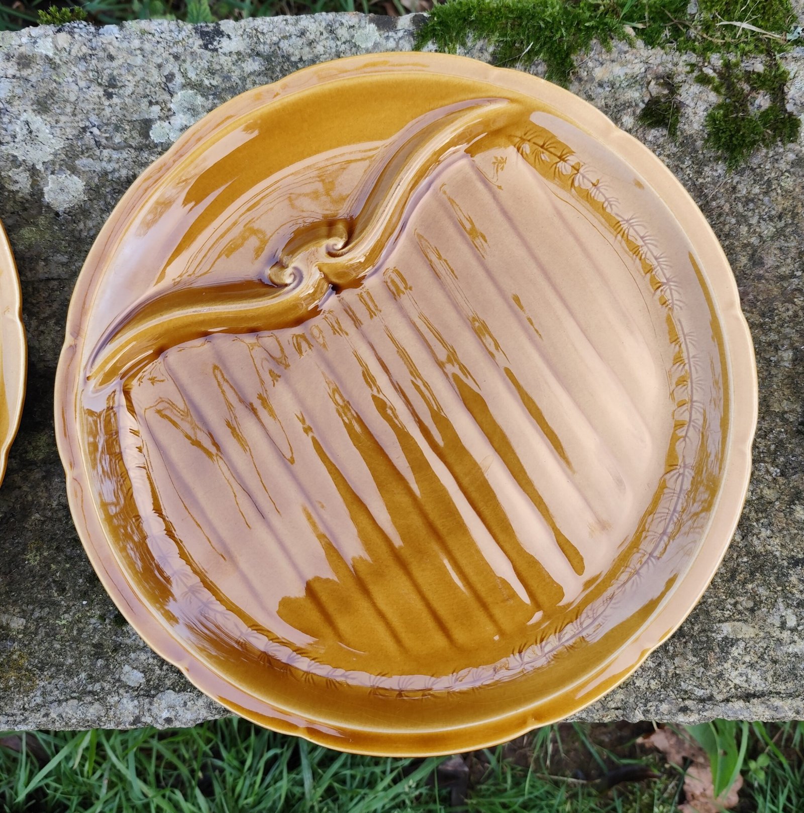 Ensemble de 6 assiettes à asperges de la manufacture de Gien. En barbotine marron. Années 1970.