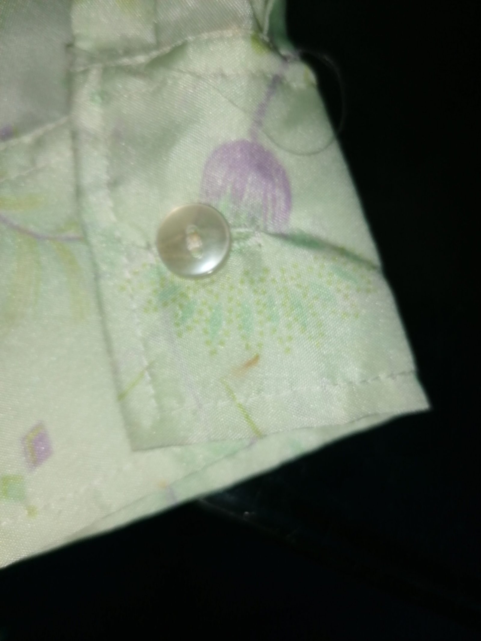 Chemise de la marque Max Derenne Paris de couleur verte et violette. Made in France. Années 70. En polyester. Double boutonnières. Petits défauts, voir les photos.