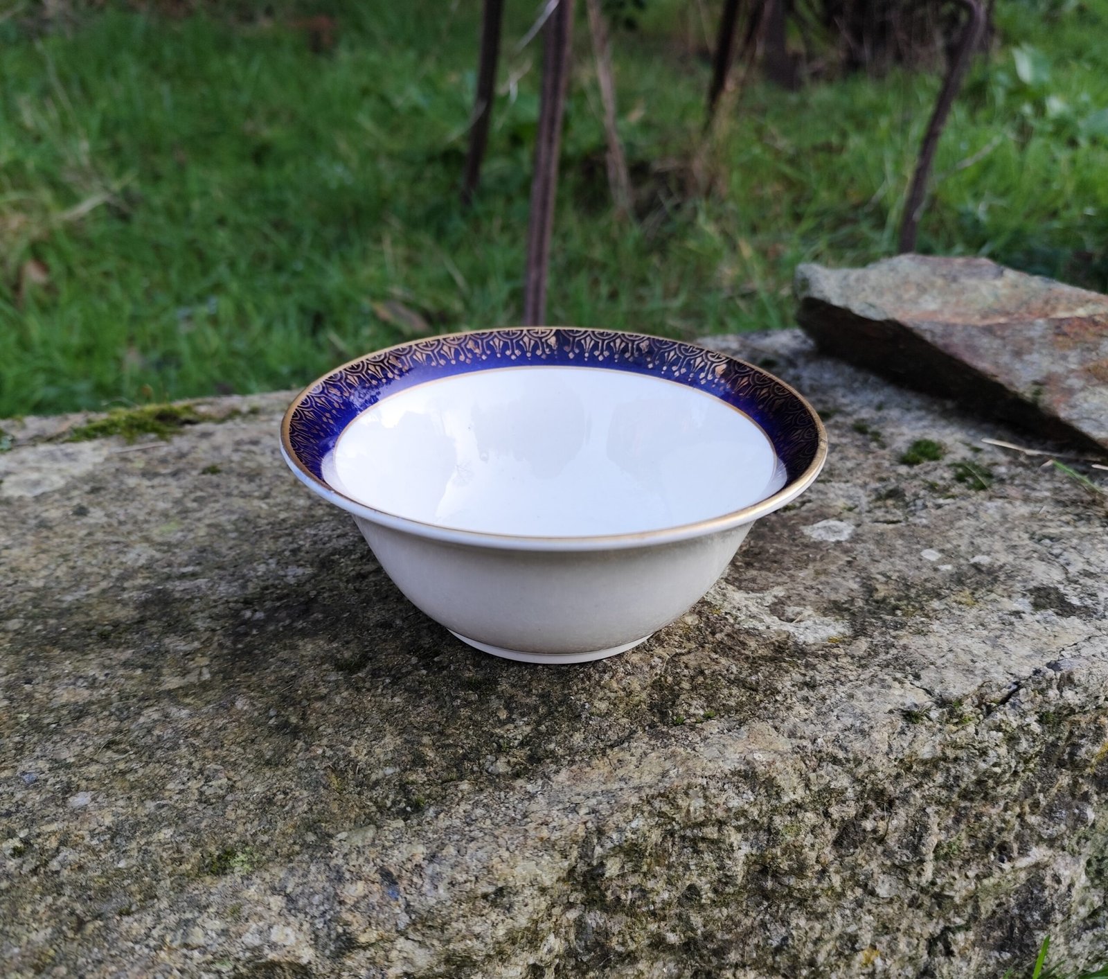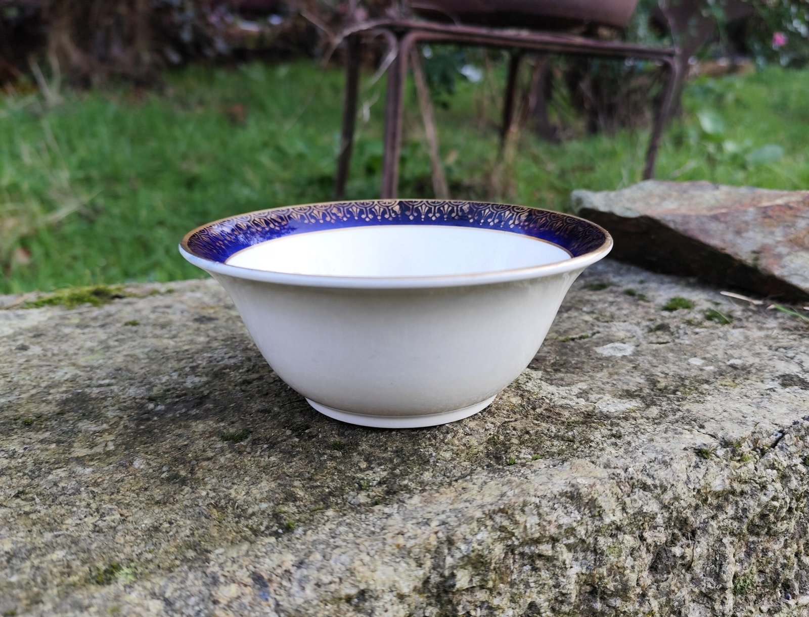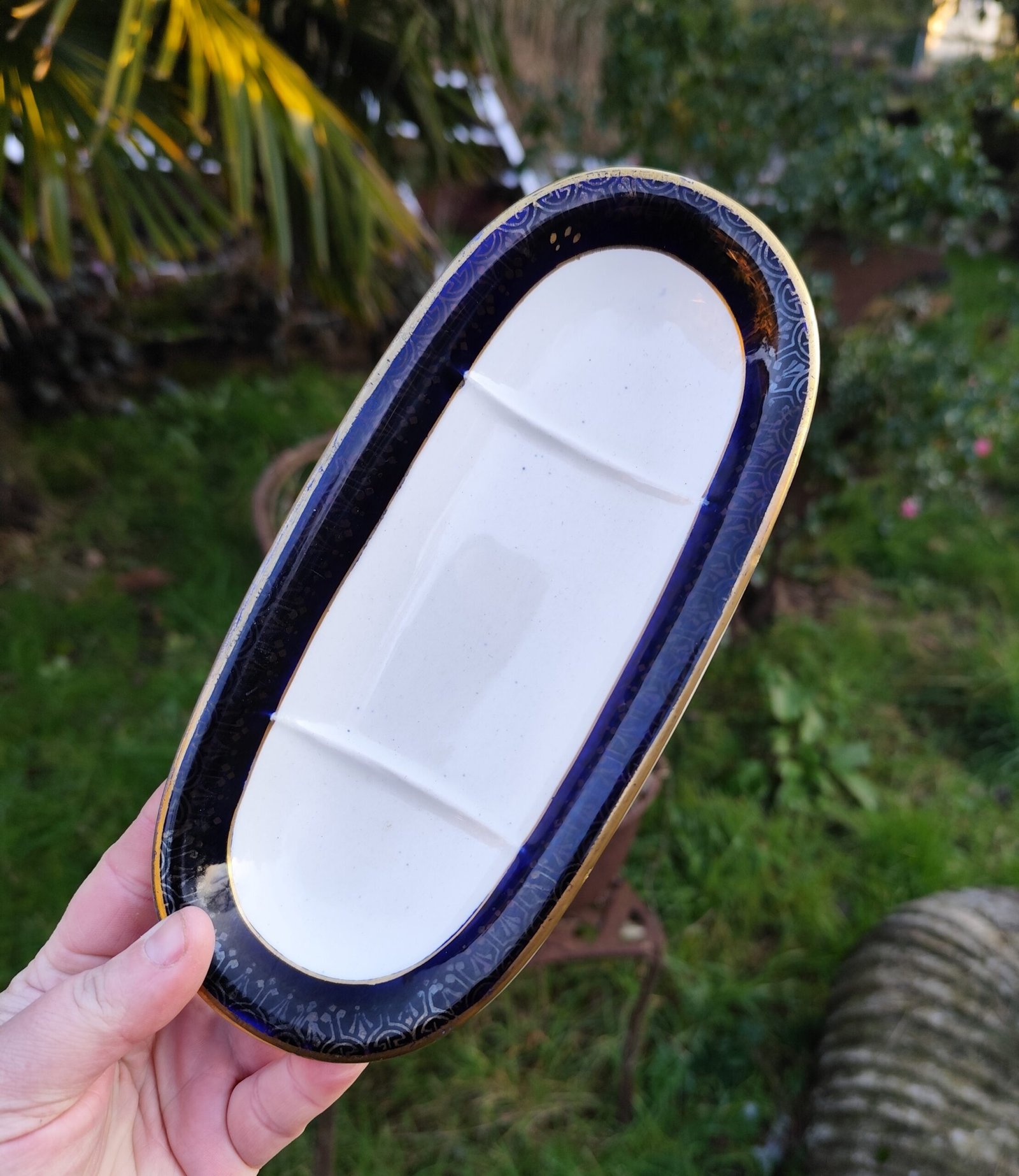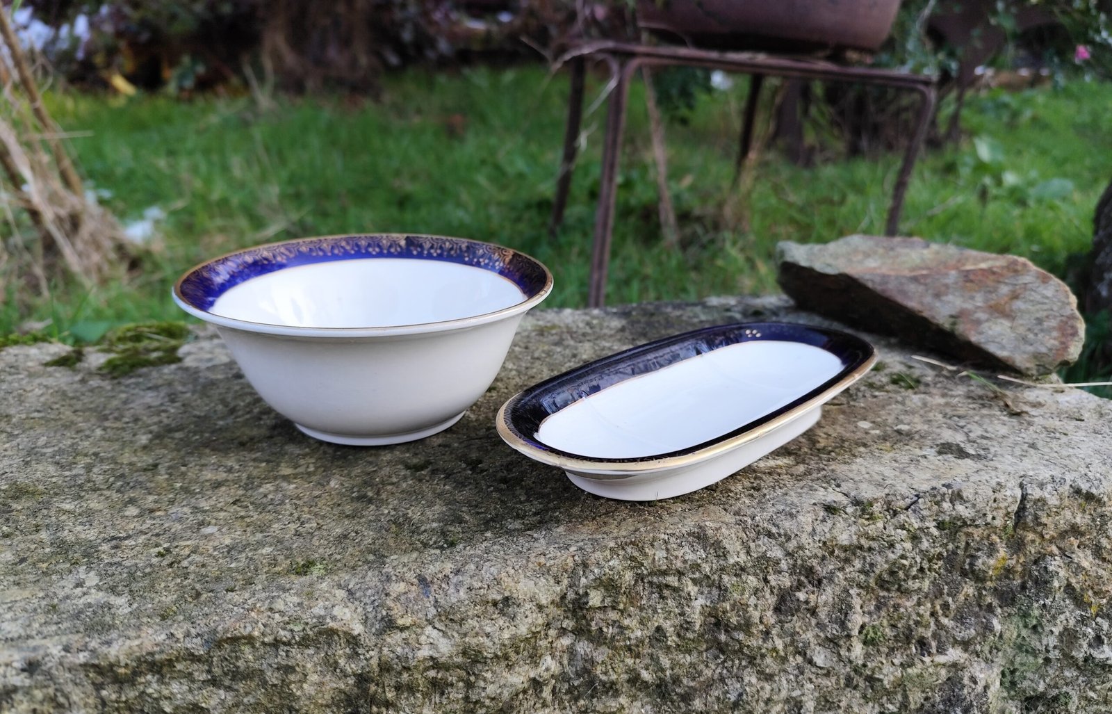 Ensemble de service de toilette composé d'un porte peigne et d'un bol à savon de la manufacture de KG Lunéville. Frise bleu et doré.