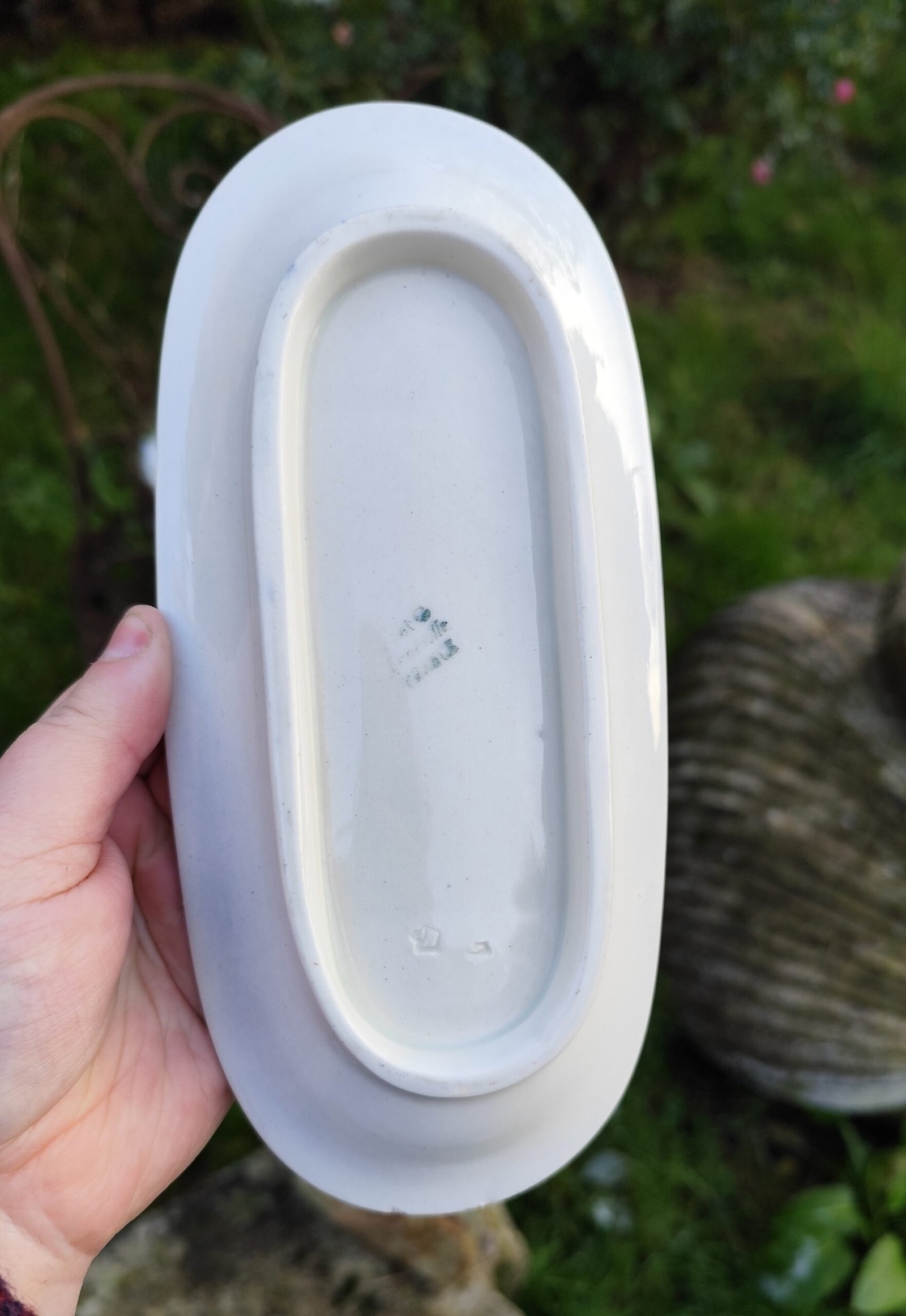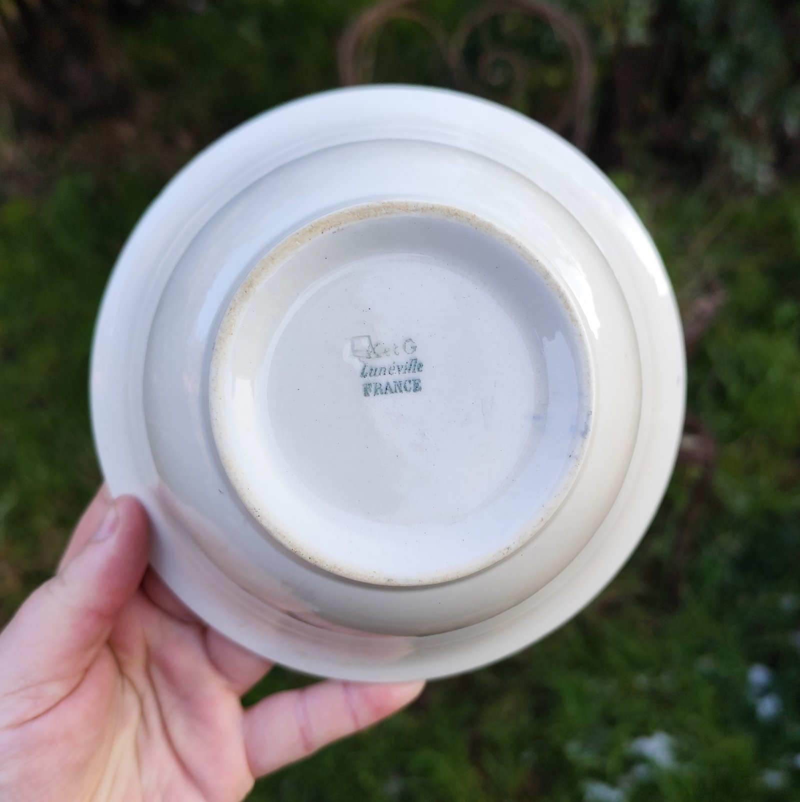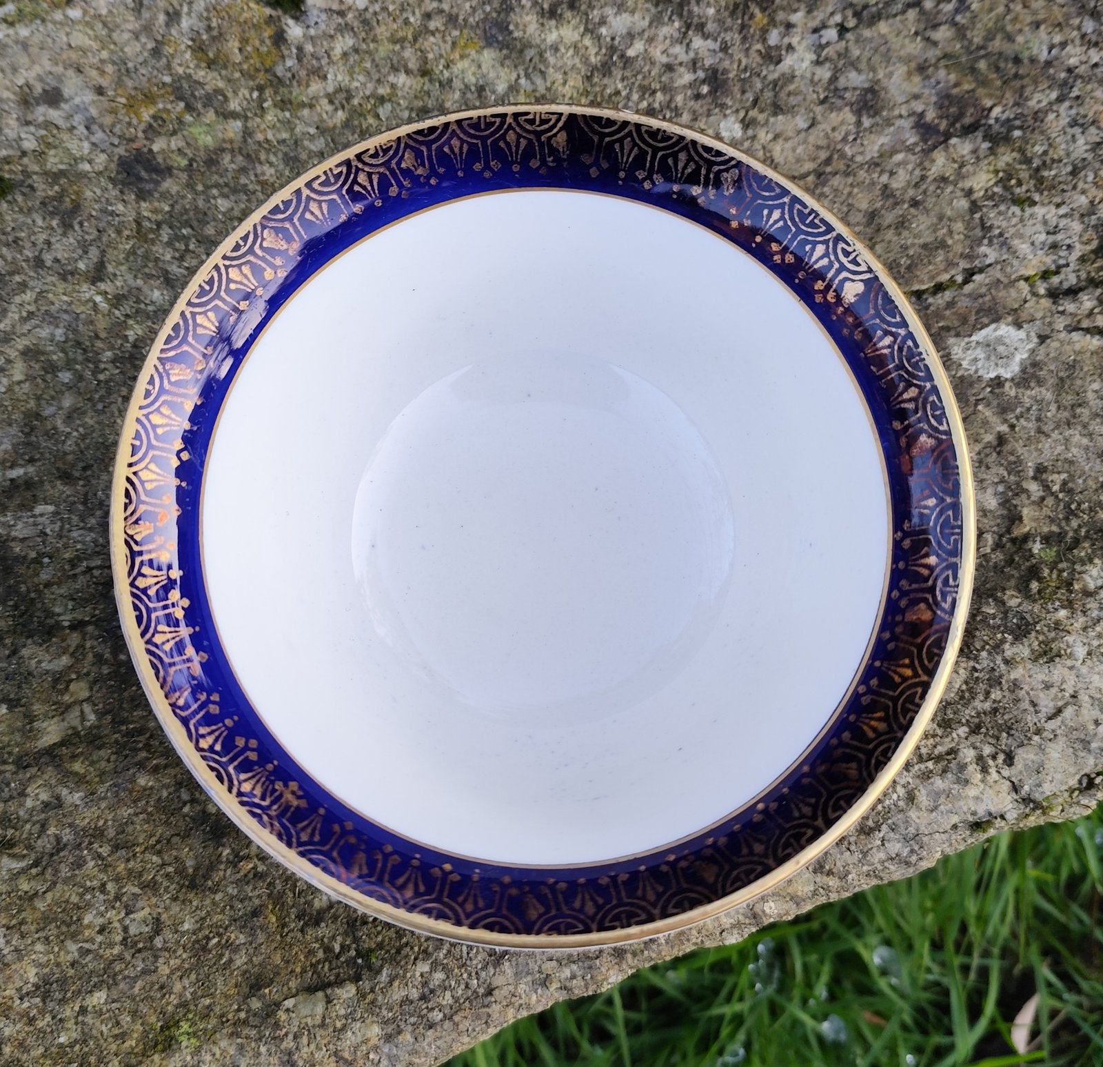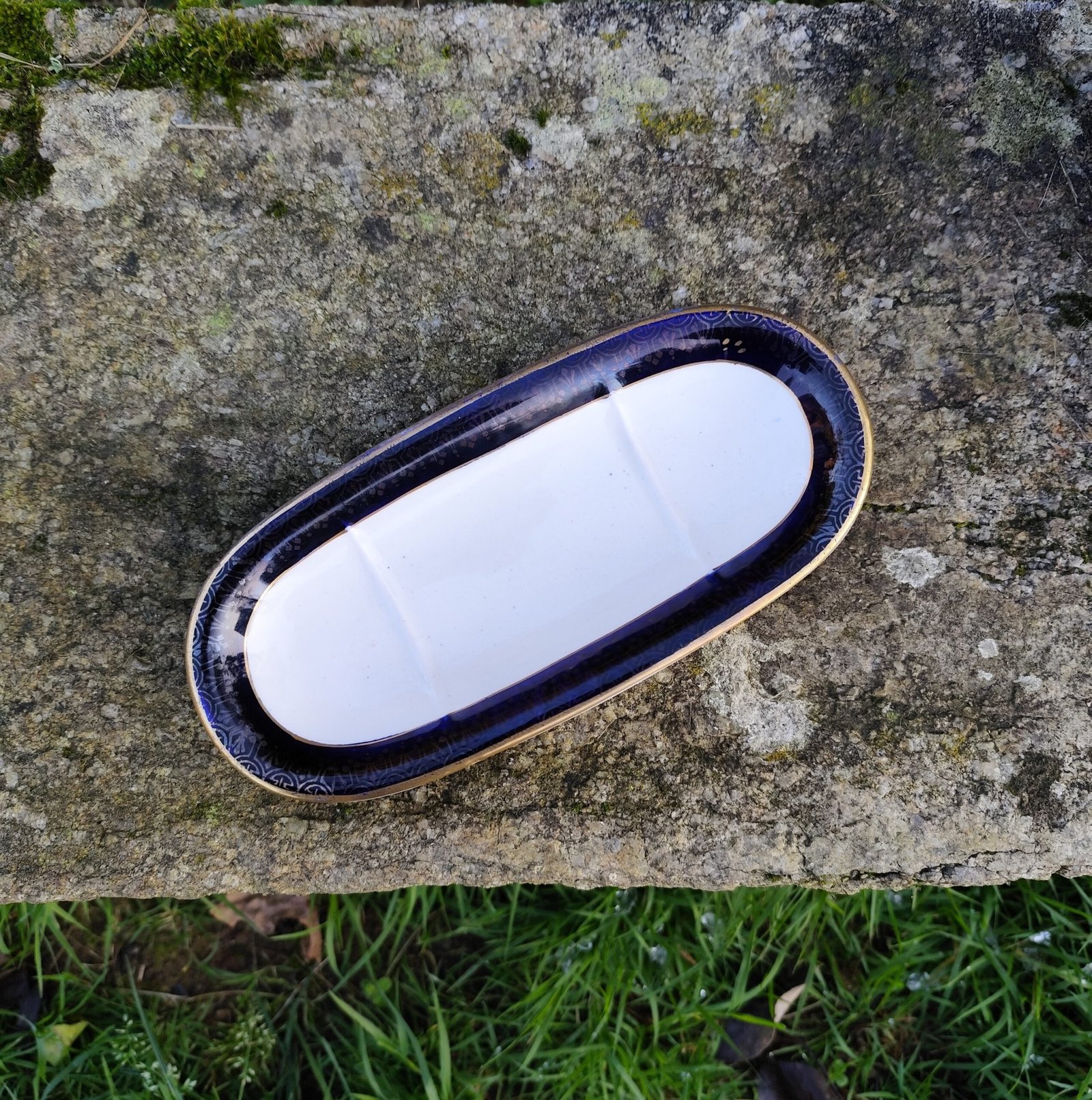 Ensemble de service de toilette composé d'un porte peigne et d'un bol à savon de la manufacture de KG Lunéville. Frise bleu et doré.