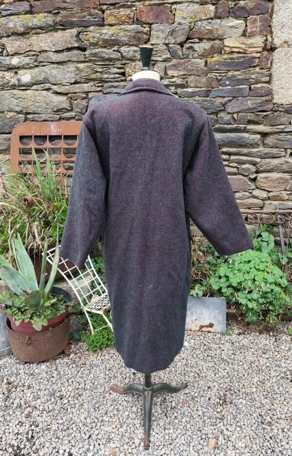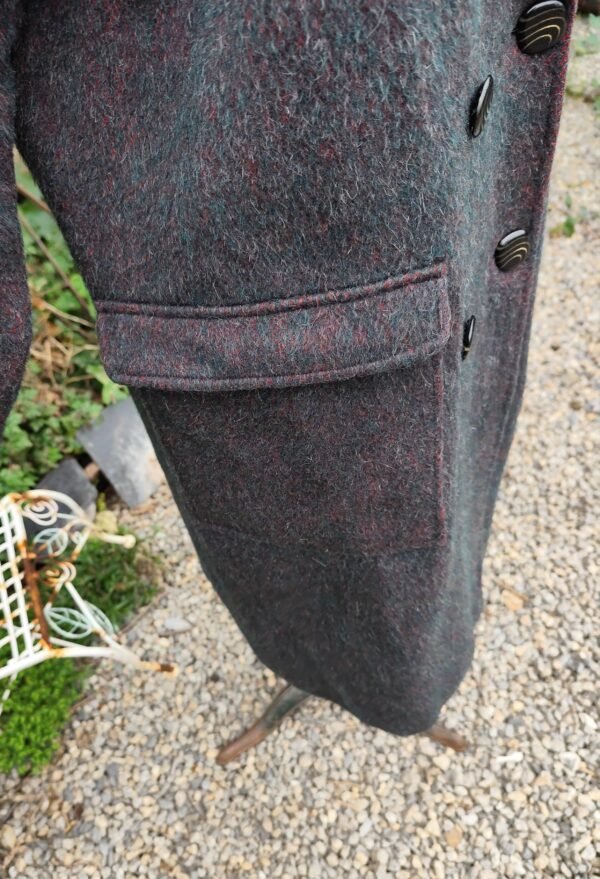 Manteau long de couleur mélangées vert et bordeaux. Surement en mélange laine et polyester. Boutons noir et doré. Deux vraies poches. Avec une doublure. Manche style chauve souris.