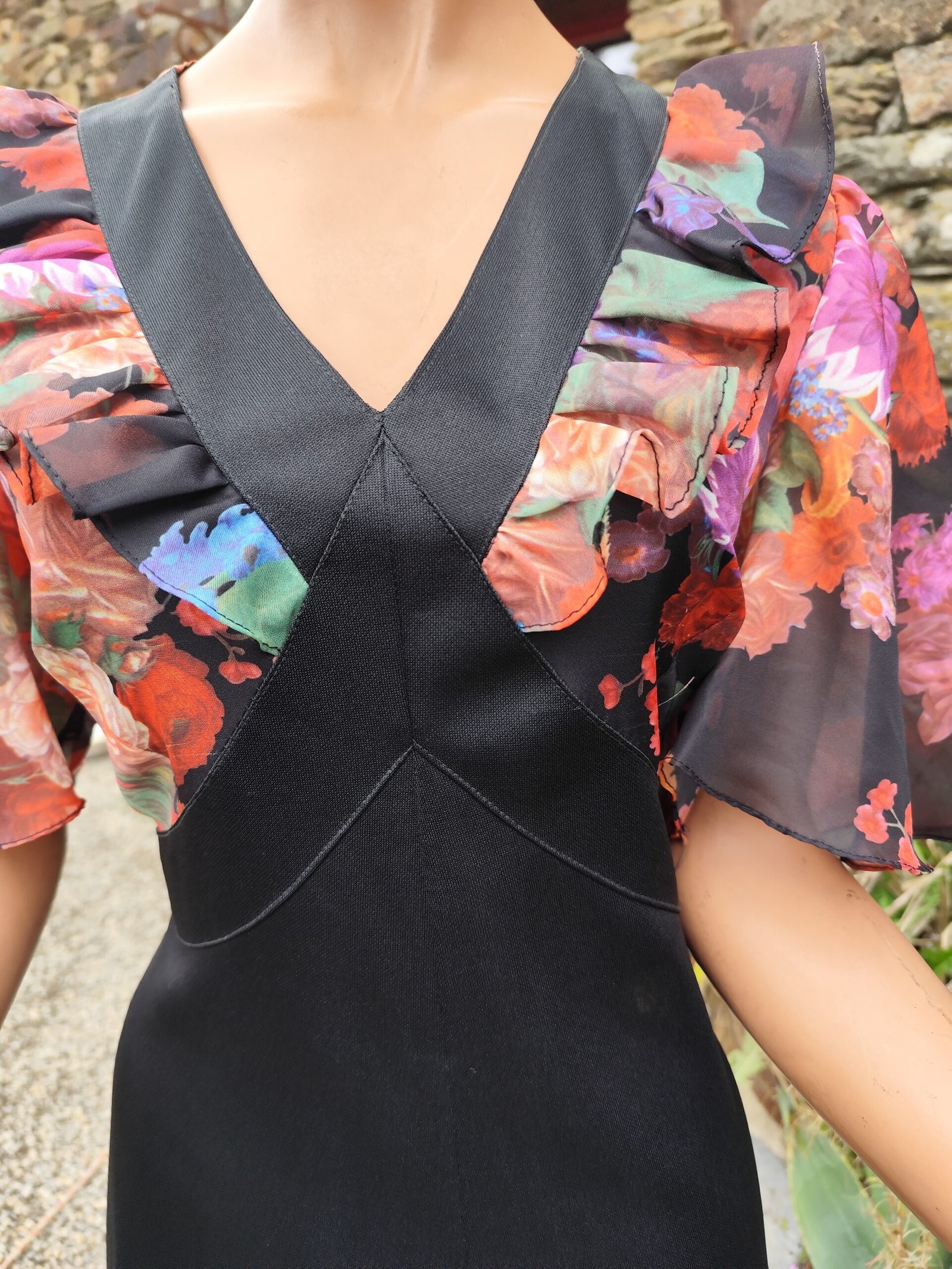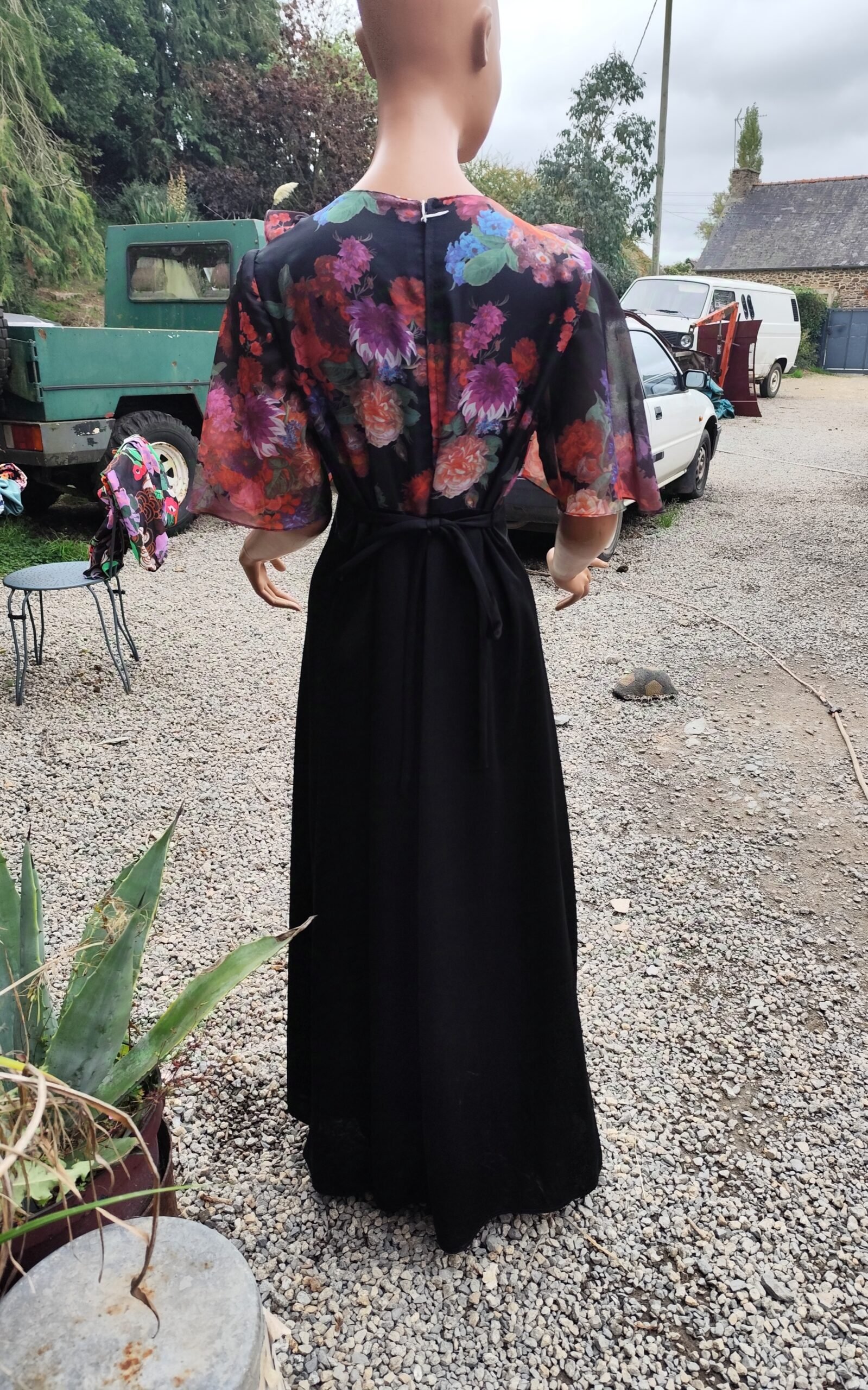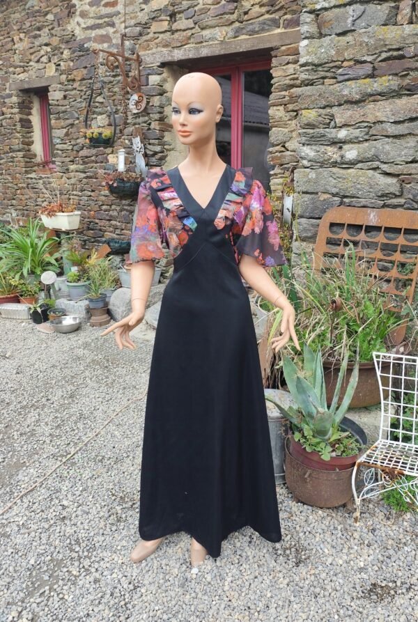 Robe longue de la marque Créations Mag Fortail Paris. En polyester. Made in France. Avec une doublure. Se noue au dos. Volants aux manches transparents. Se ferme au dos avec une fermeture éclair.