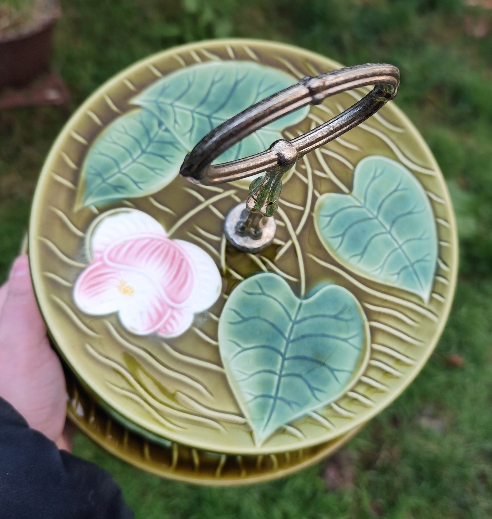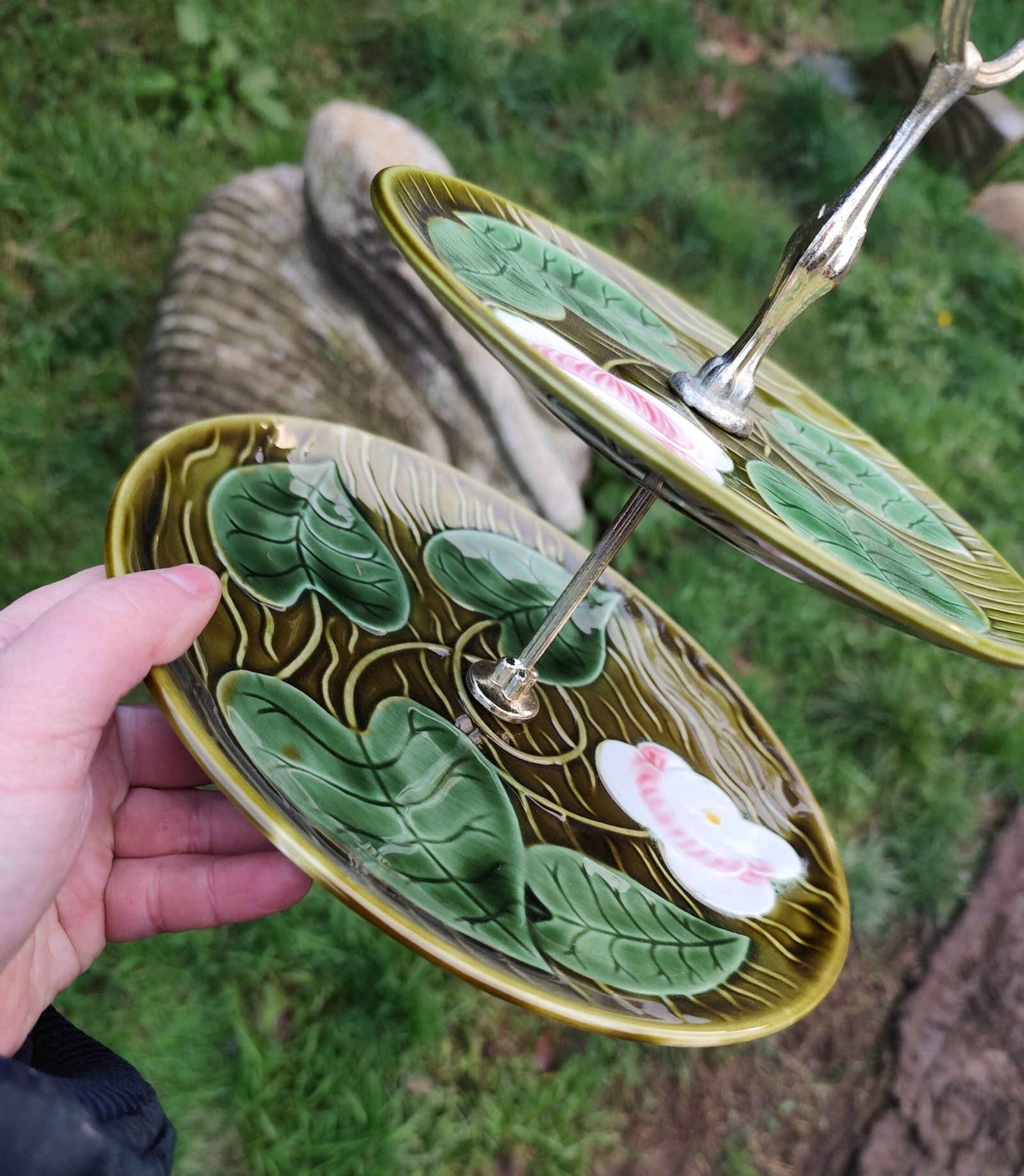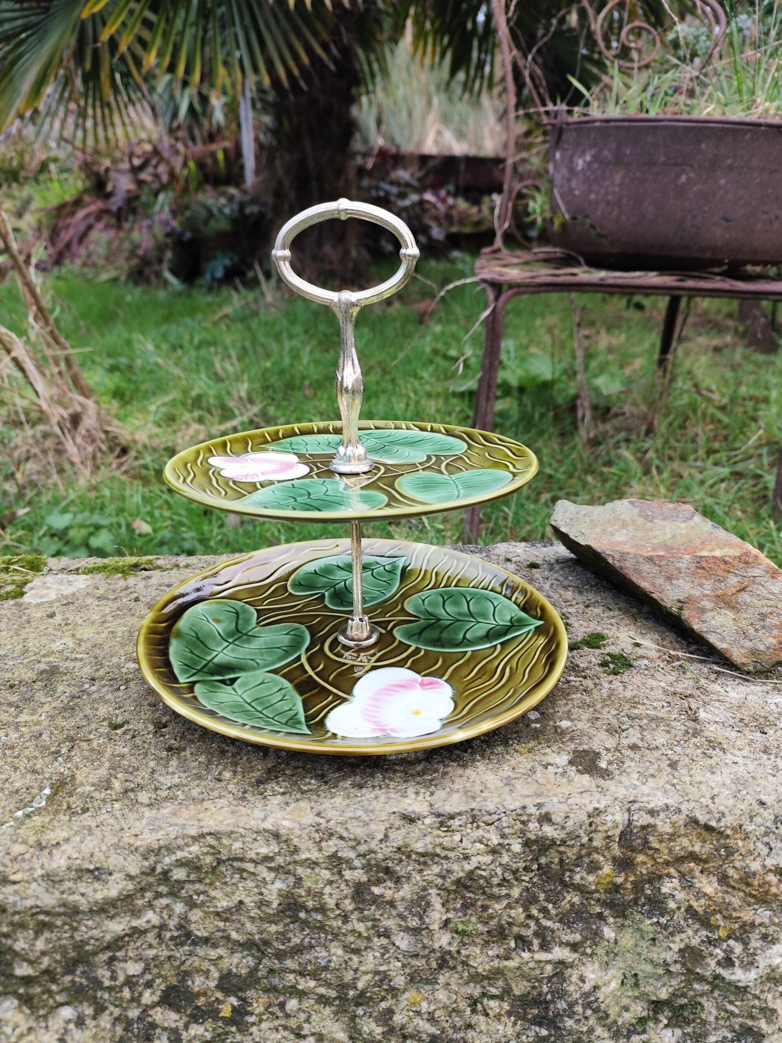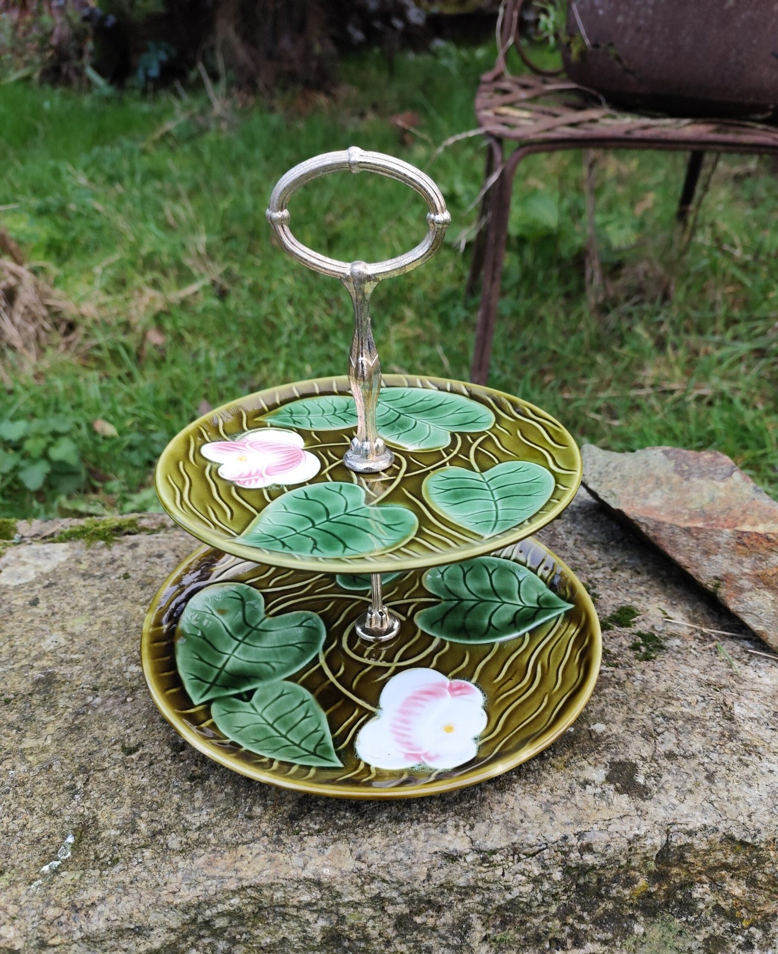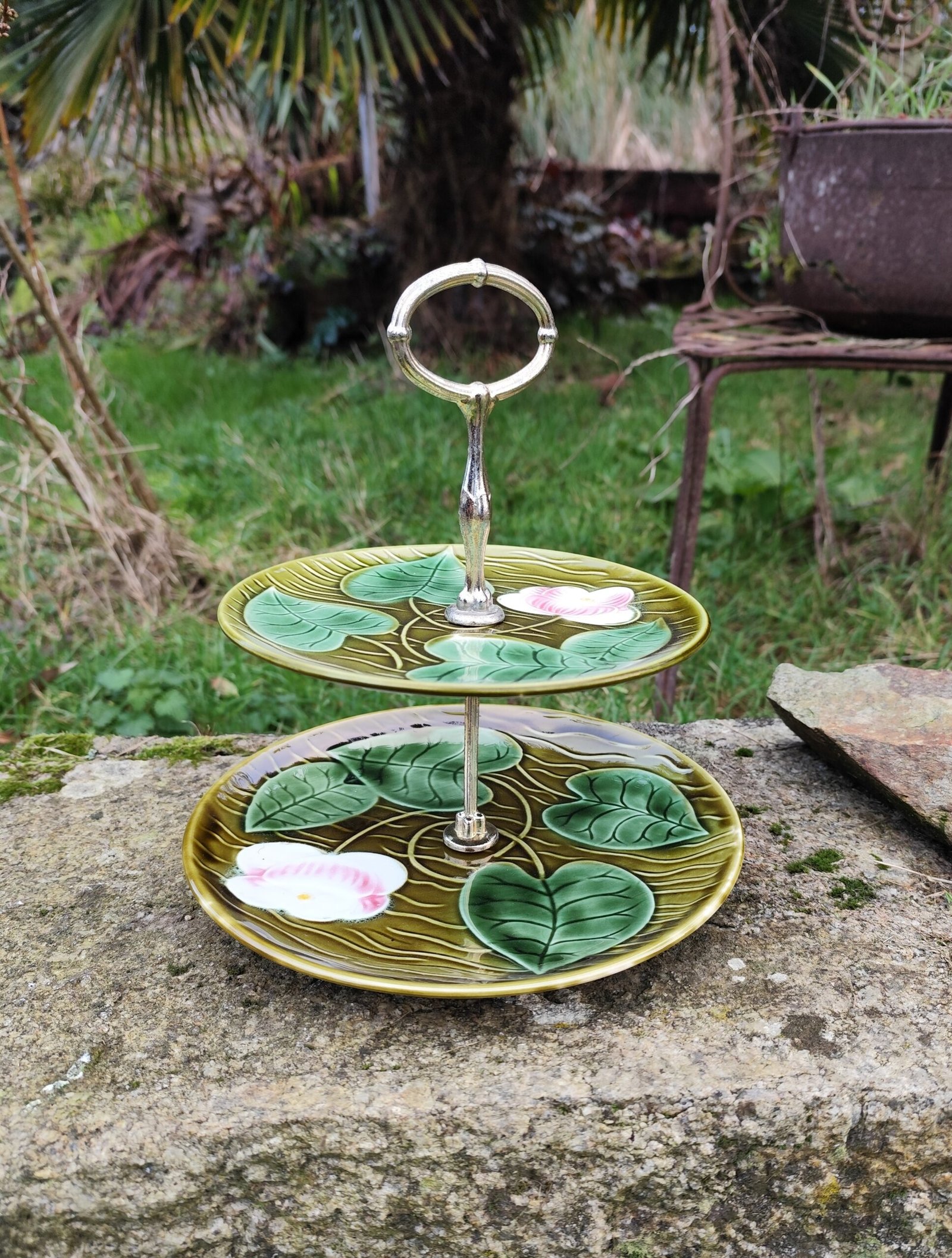 Serviteur à deux étages de la manufacture de Sarreguemines, modèle Irene. En barbotine verte à motif de feuilles et de fleurs.