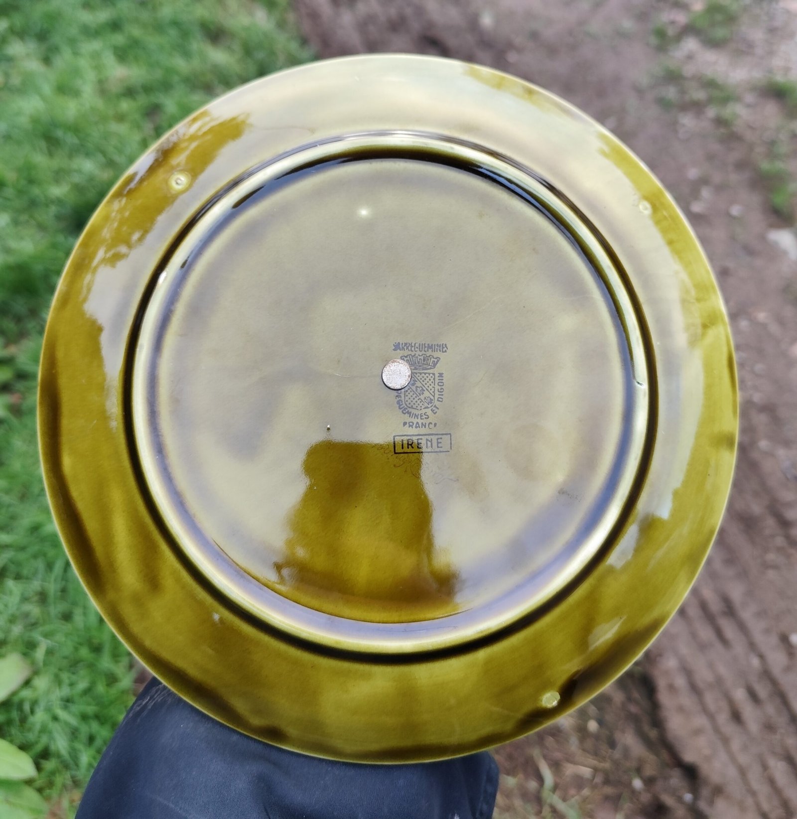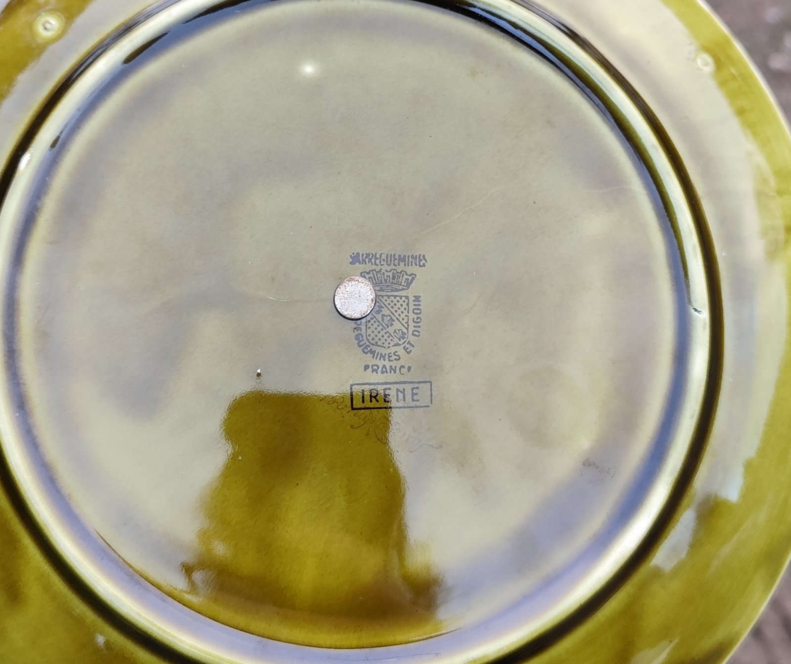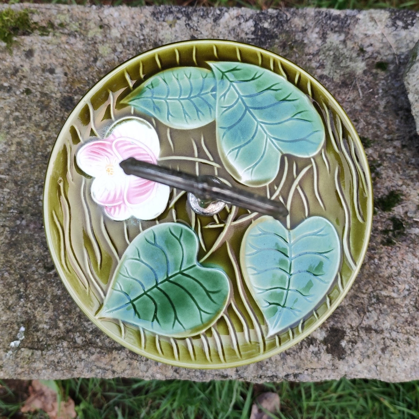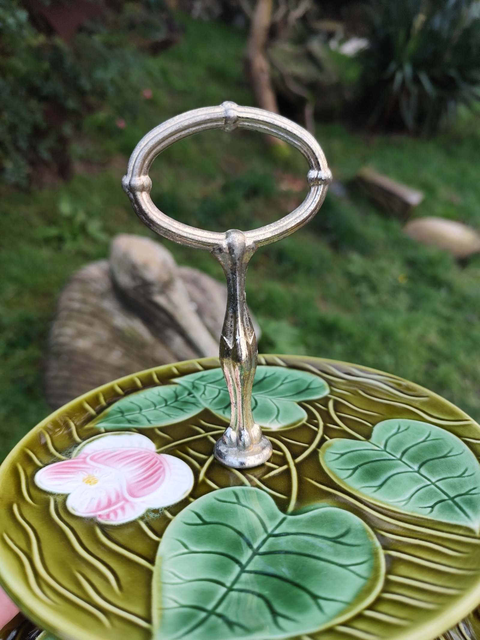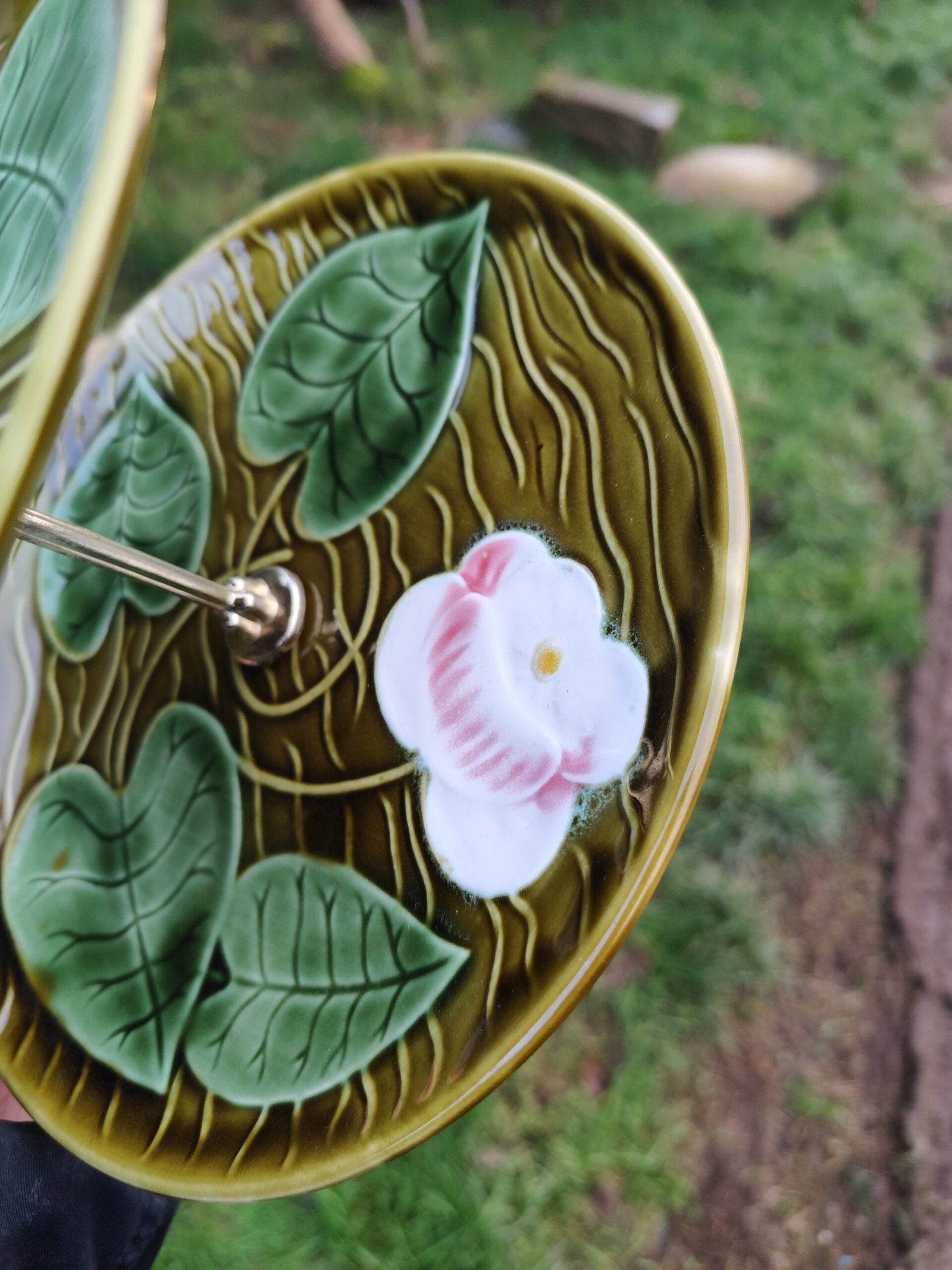 Serviteur à deux étages de la manufacture de Sarreguemines, modèle Irene. En barbotine verte à motif de feuilles et de fleurs.